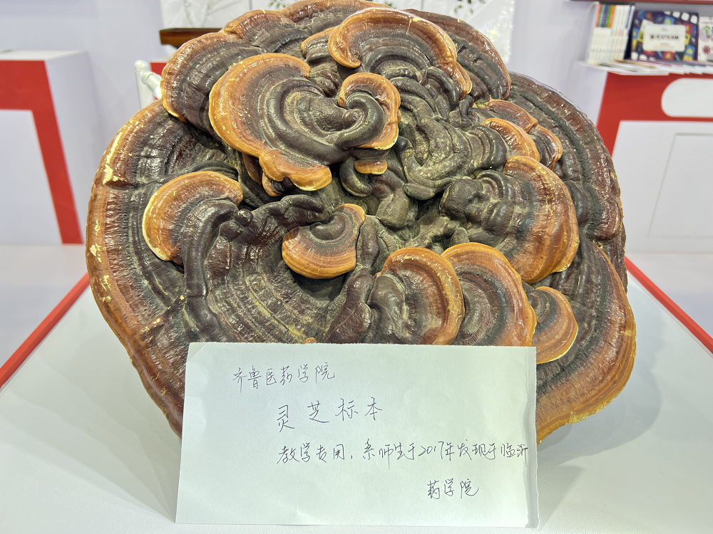 現場的透明玻璃展柜里,一個直徑45厘米的碩大野生靈芝十分引人矚目,旁邊還有水牛角、鹿茸、龜甲、蛤蚧等名貴中藥材,這些都是齊魯醫藥學院在現場展示的中藥材教具。此外,還有防風、蜀葵、白薇、忍冬等中藥材標本,每個藥材標本都用一張白紙板裝裱,懸掛在墻上宛若一幅幅畫作,成為獨具特色的一景。