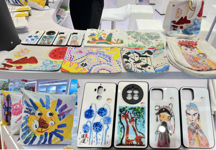 展區一角,一排排色彩繽紛的帆布包、鼠標墊、抱枕以及T恤衫,頻頻引得觀展者前來詢問。“這些物品上的圖案,都是銀座幼教的小朋友們手繪的,最小的年齡不到3歲,最大的是6歲。”參展教師介紹道。作為全國幼教領軍品牌,銀座幼教還通過特色課程現場展示,讓眾多觀展者對其有了更加深入的認知。