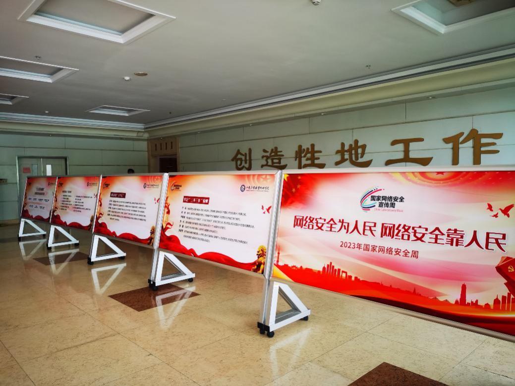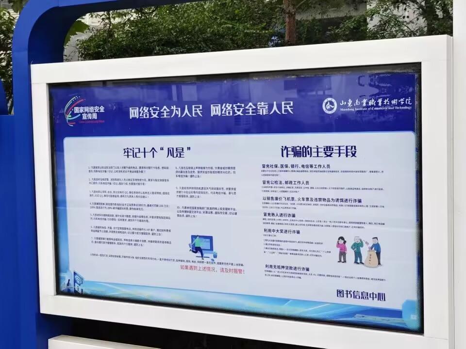 學院在辦公樓、教學樓、圖書館大廳、學生餐廳等處設置電子屏、展架、海報、條幅等宣傳物料,形成固定的宣傳陣地,普及網絡安全知識。