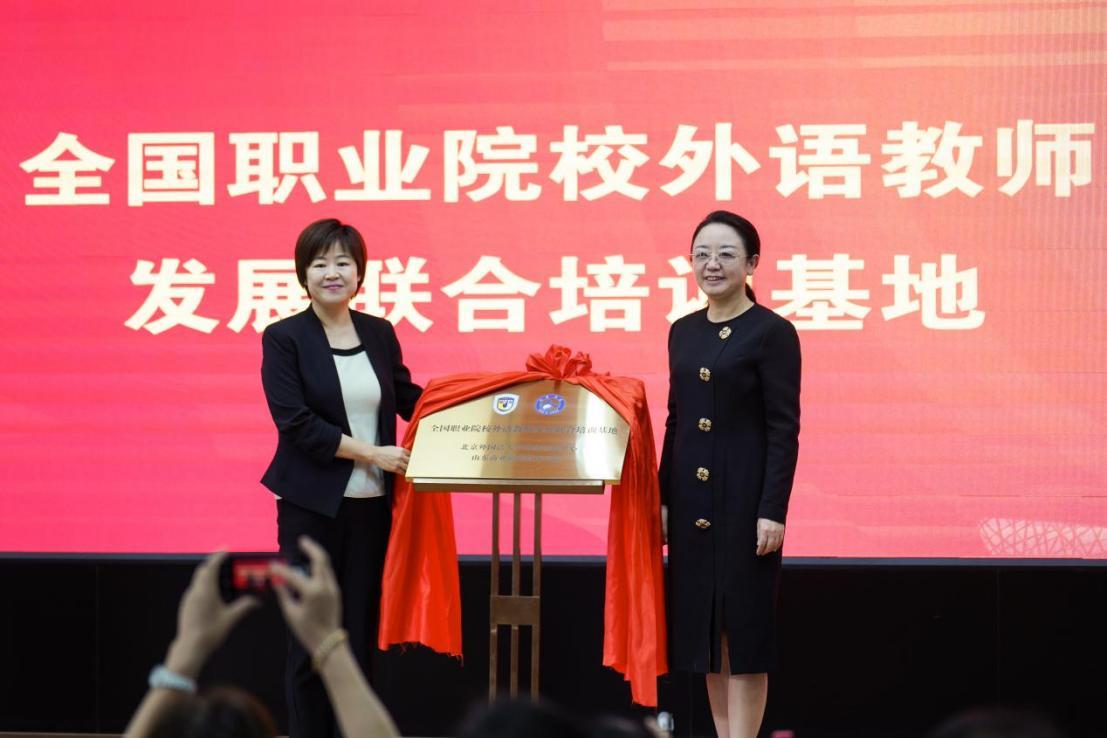 比賽開幕式上,山東商職學院黨委副書記、院長王鑫,外語教學與研究出版社職業教育出版分社社長李淑靜共同為山東商職學院全國職業院校外語教師發展聯合培訓基地揭牌并致辭。