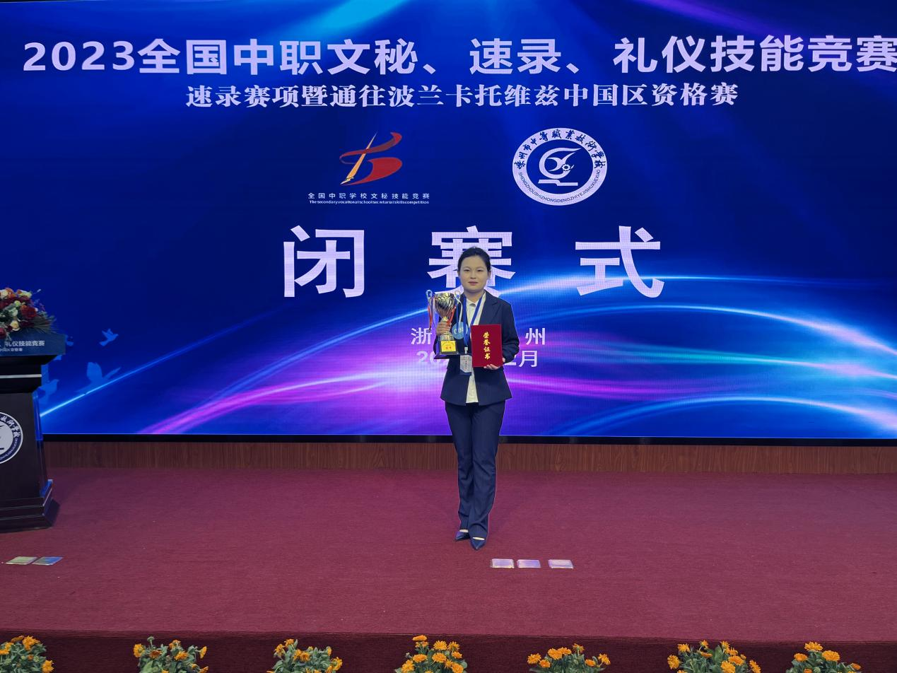 近日,2023全國(guó)中職文秘、速錄、禮儀技能競(jìng)賽速錄賽項(xiàng)暨通往波蘭卡托維茲中國(guó)區(qū)資格賽在浙江嵊州落下帷幕。山東城市服務(wù)職院商務(wù)文秘專(zhuān)業(yè)選手孫雨彤以542字/分的成績(jī),斬獲“極限看打”全國(guó)冠軍,獲得波蘭卡托維茲國(guó)際速聯(lián)大賽的入場(chǎng)券。