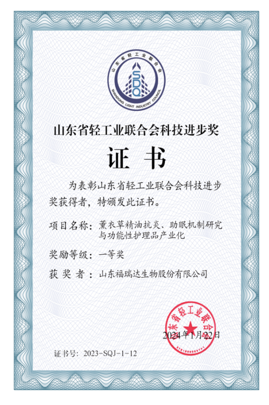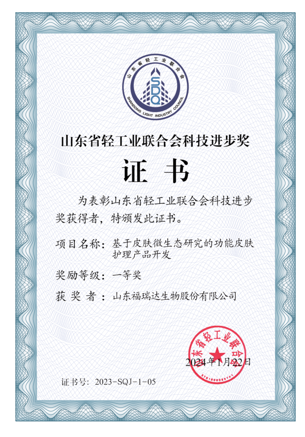 近日,省輕工業聯合會發布《關于2023年度山東省輕工業聯合會科學技術獎勵的決定》,福瑞達生物申報的“基于皮膚微生態研究的功能皮膚護理產品開發”“薰衣草精油抗炎、助眠機制研究與功能性護理品產業化”兩個項目榮獲2023年度山東省輕工業聯合會科技進步獎一等獎。