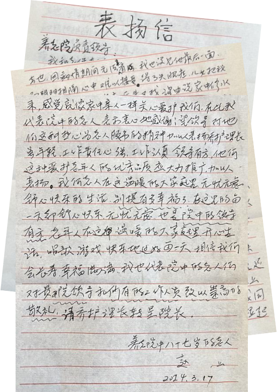 3月的一個上午,濟南魯商福瑞達護理院三樓護理長喬麗萍像往常一樣進行巡房,一進入318房間,屋里的趙奶奶便拿起幾張信紙招呼她道:“喬,謝謝你們這一年的照顧,我寫了一封信麻煩你轉交給領導!”