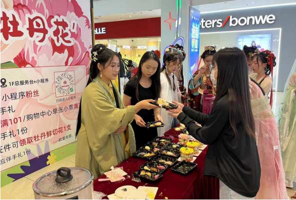 4月13日至5月5日,“嘻游劇場·城市花園”主題劇場陸續(xù)開展“送你一朵牡丹花”“牡丹花朝節(jié)”“牡丹佳肴”等活動,邀消費(fèi)者共同賞牡丹、品牡丹、拍牡丹,構(gòu)建城市文化屬性消費(fèi)場景。其中,4月13日組織開展的“千人舞慶牡丹節(jié)”活動,超千人次參與,菏澤廣電等媒體高頻傳播,擴(kuò)大了活動的熱度。