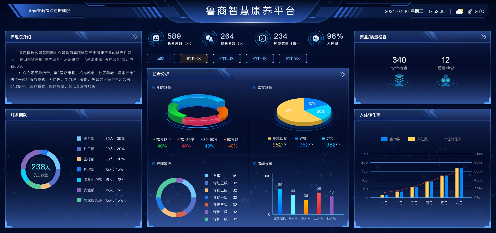 “魯商智慧康養院務管理平臺由魯商產投所屬魯商福瑞達健康公司聯合魯商科技共同打造,是基于養老服務領域數字化轉型需求,以濟南魯商福瑞達護理院咨詢、入住、護理、醫療、評估、膳食等養老服務場景為藍本,研發的一款數字化智慧康養服務平臺。通過推動云計算、大數據、物聯網等數字化技術在養老服務領域的融合創新和多場景應用,實現對長者身體狀況數字化管理以及養老機構護理資源的優化配置,從而實現多層次、個性化養老需求的一站式護理服務,提升服務質效。