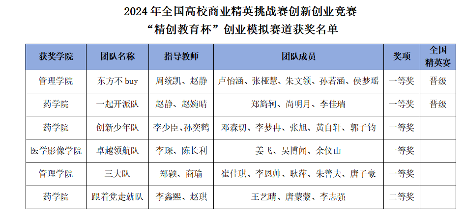 近日,2024全國高校商業精英挑戰賽創新創業競賽“精創教育杯”創業模擬賽道全國總決賽落下帷幕,齊魯醫藥學院6支參賽獲得全國一等獎5項、二等獎1項,其中2支隊伍晉級全國精英賽。