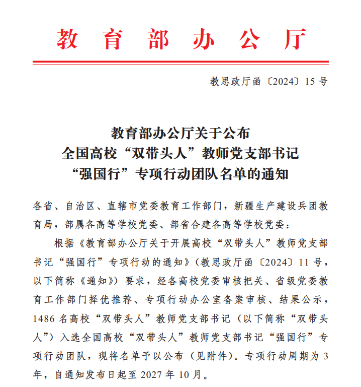 全國高校“雙帶頭人”教師黨支部書記“強(qiáng)國行”專項(xiàng)行動(dòng),旨在落實(shí)立德樹人根本任務(wù),深入貫徹落實(shí)教育部黨組關(guān)于高校“雙帶頭人”教師黨支部書記(以下簡稱高校“雙帶頭人”)培育工作的部署要求,充分發(fā)揮高校“雙帶頭人”的示范引領(lǐng)作用,引導(dǎo)廣大師生在以中國式現(xiàn)代化全面推進(jìn)強(qiáng)國建設(shè)、民族復(fù)興偉業(yè)新征程上砥礪新?lián)?dāng),展現(xiàn)新作為。