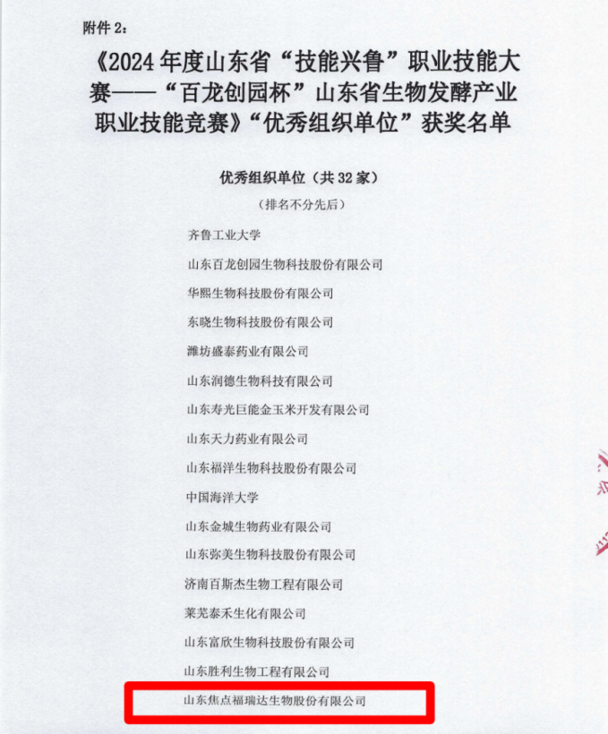 近日,2024年度山東省“技能興魯”職業技能大賽——山東省生物發酵產業職業技能競賽獲獎名單公布,福瑞達旗下焦點福瑞達、福瑞達生物科技、福瑞達生物股份憑借優異的競賽成績和良好的作風表現被大賽組委會評選為“優秀組織單位”。在職工組化學檢驗工、生化檢驗工、淀粉及淀粉糖制造工3個競賽項目中,13名職工榮獲個人一、二、三等獎。