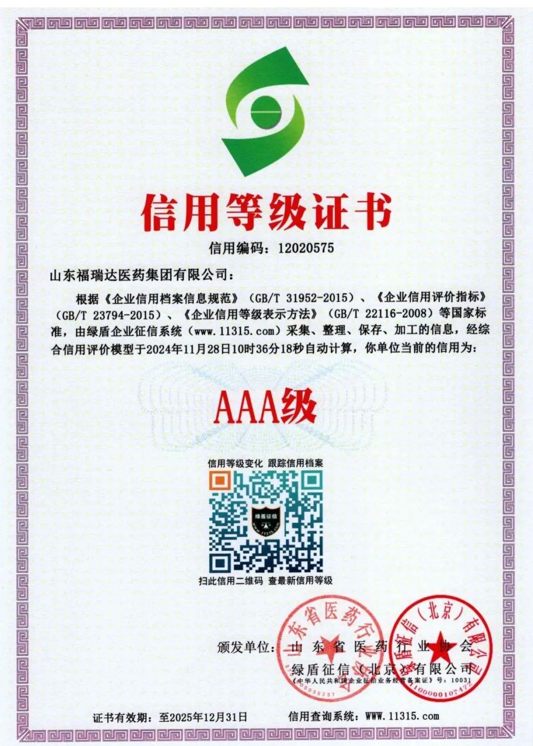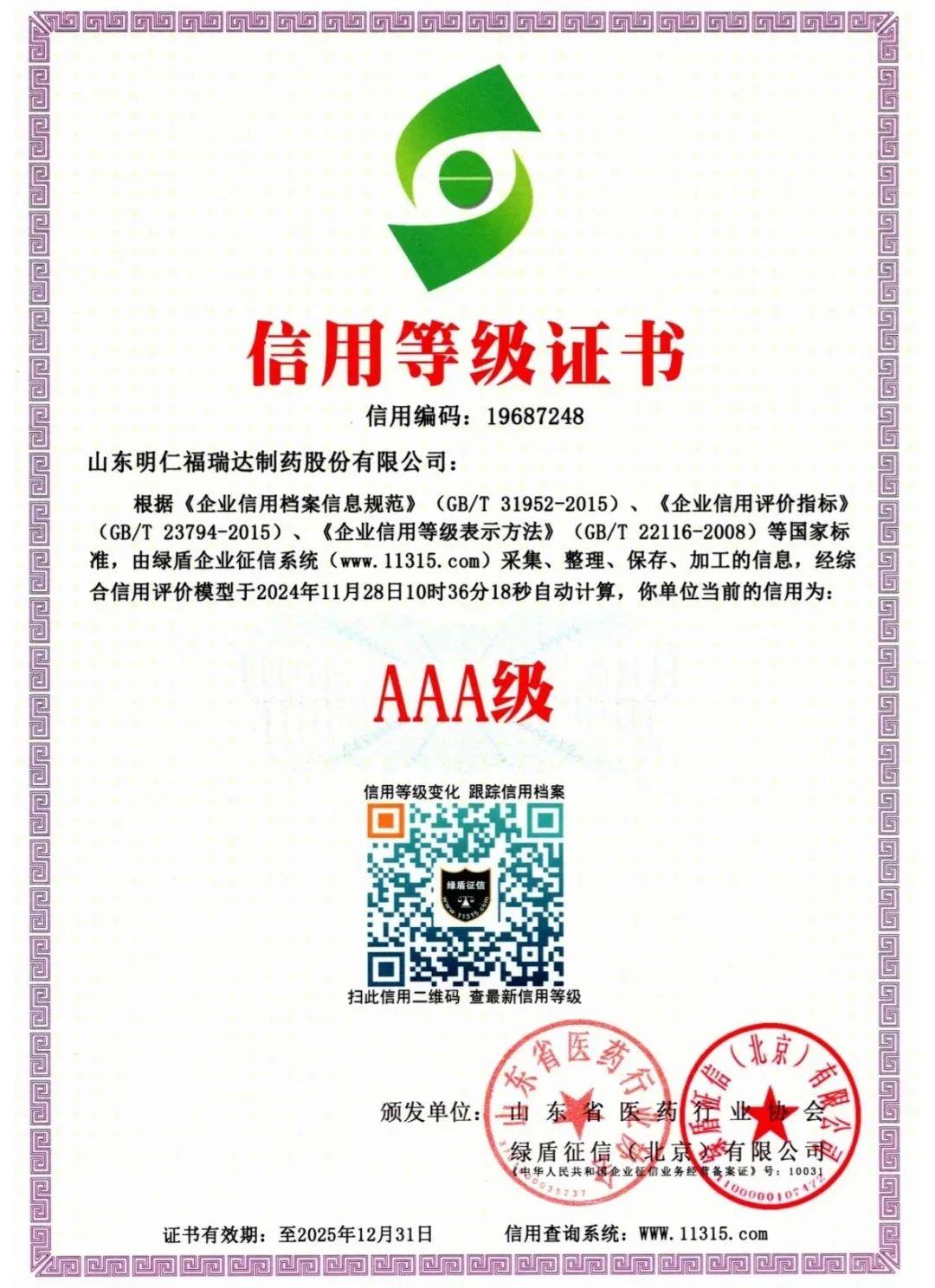 近日,福瑞達與明仁福瑞達順利通過山東省醫(yī)藥行業(yè)協(xié)會和第三方權威征信機構的評估審核,獲得AAA級企業(yè)信用等級證書,這是兩家企業(yè)連續(xù)四年榮獲該項認證,進一步彰顯了公司在市場中的卓越信譽和行業(yè)領先地位。