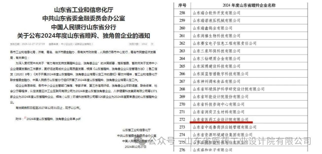 12月27日,省工信廳公布2024年度山東省瞪羚、獨角獸企業名單,省醫工院憑借卓越的高成長性、高發展潛力和高科技創新能力,成功獲評2024年度山東省瞪羚企業。