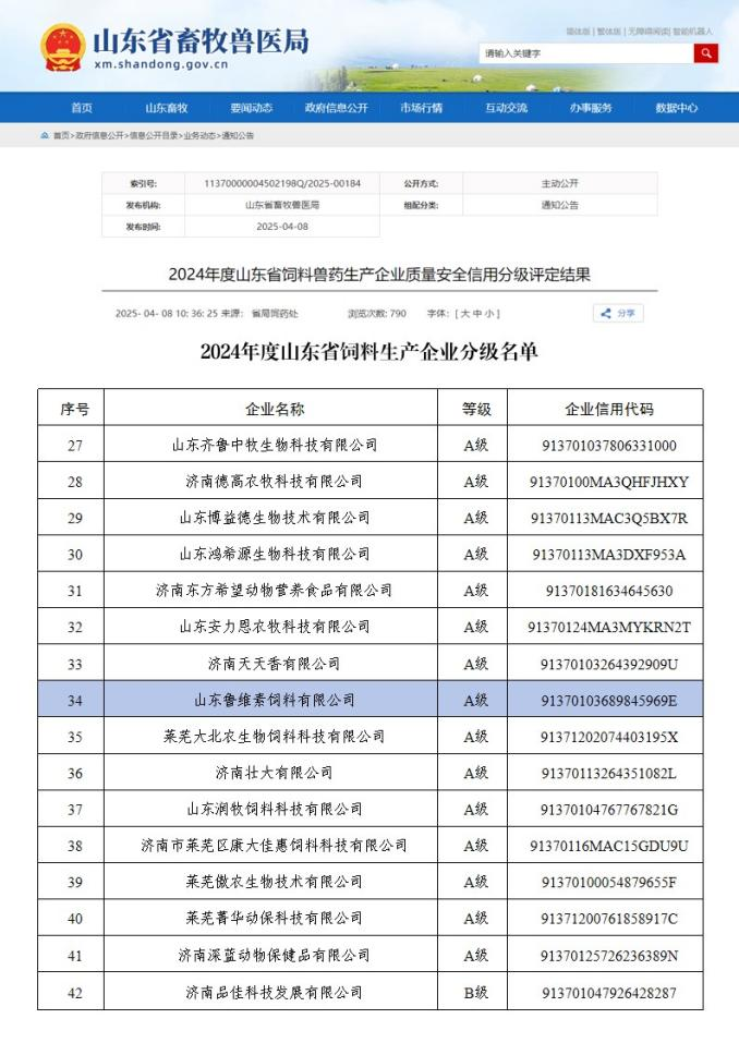 近日,山東省畜牧獸醫(yī)局正式發(fā)布2024年度飼料獸藥生產(chǎn)企業(yè)質(zhì)量安全信用分級(jí)評(píng)定結(jié)果,牧工商所屬魯維素獲評(píng)“山東省飼料生產(chǎn)企業(yè)信用分級(jí)A級(jí)單位”。