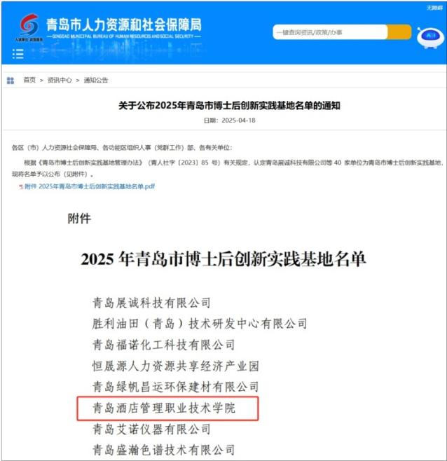 近日,青島市人力資源和社會保障局公布了2025年青島市博士后創(chuàng)新實踐基地名單,青島酒店管理職院成功獲批,高層次人才載體建設(shè)取得又一重要突破。