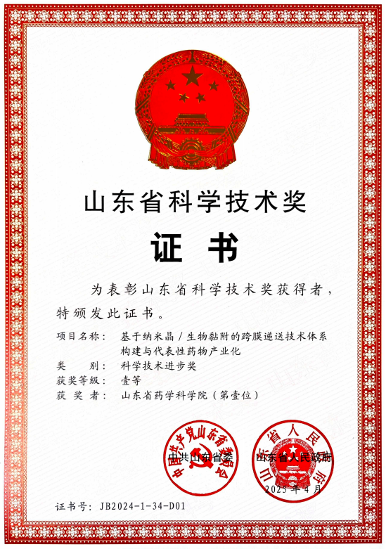 6月27日,山東全省科技大會在濟(jì)南召開,山東省藥學(xué)科學(xué)院牽頭研發(fā)的《基于納米晶/生物黏附的跨膜遞送技術(shù)體系構(gòu)建與代表性藥物產(chǎn)業(yè)化》項目榮獲省科學(xué)技術(shù)進(jìn)步獎一等獎。