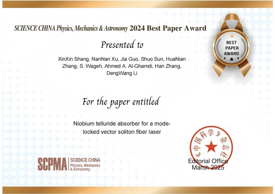 近日,從《中國科學》雜志社獲悉,齊魯醫藥學院醫學影像學院教師尚新新博士發表于國際著名學術期刊《SCIENCE CHINA Physics, Mechanics & Astronomy》的研究論文《Niobium telluride absorber for a mode-locked vector soliton fiber laser》(基于碲化鈮飽和吸收體的矢量孤子超快光纖激光器)榮獲該刊頒發的“2024年度優秀論文獎”。