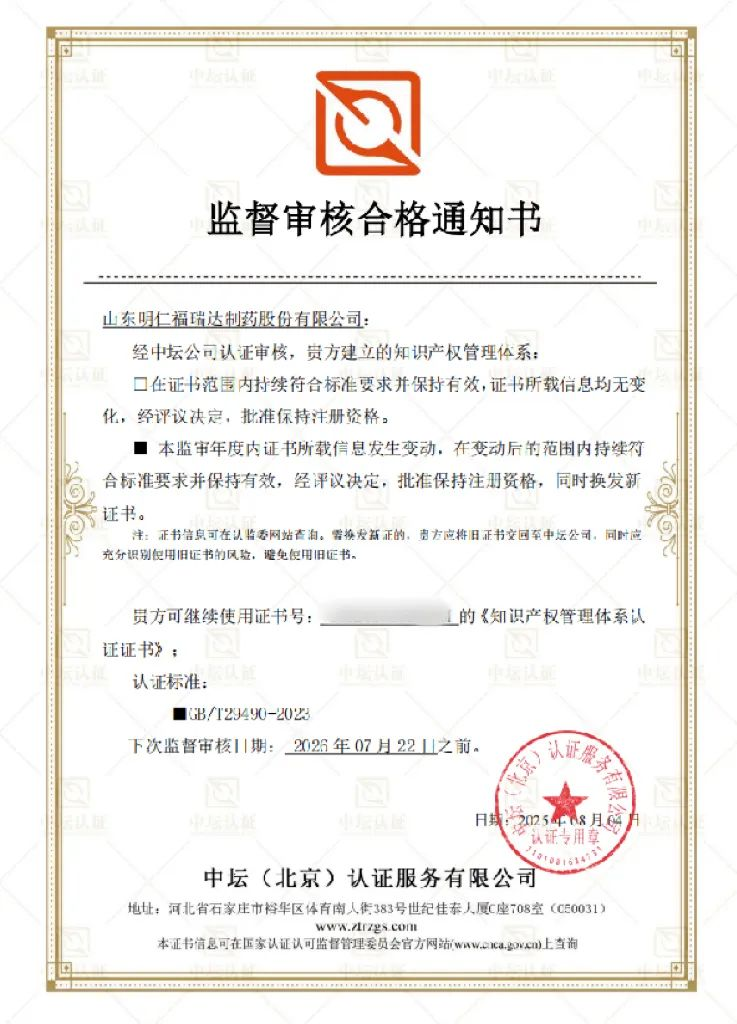 近日,山東明仁福瑞達制藥股份有限公司經嚴格評審,順利通過知識產權合規管理體系現場監督審核,成功保持認證資格并換發新證書,標志著企業在知識產權規范化管理領域再邁堅實一步。