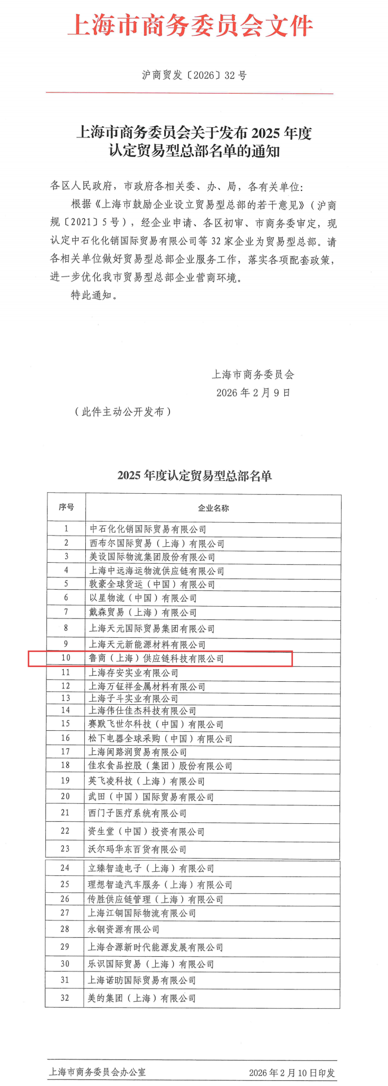 近日,上海市商務委員會正式公布了2025年度認定的32家貿易型總部名單,魯商(上海)供應鏈科技有限公司憑借穩健的業務基礎、良好的行業積淀與成熟的綜合服務能力成功入選。