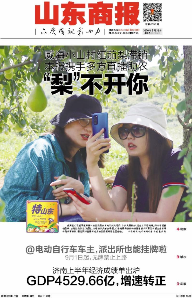全民戰(zhàn)疫,愛(ài)心助農(nóng)。自新冠肺炎疫情發(fā)生以來(lái),農(nóng)業(yè)大省山東多地的優(yōu)質(zhì)農(nóng)產(chǎn)品出現(xiàn)滯銷(xiāo)現(xiàn)象。作為省級(jí)主流媒體,躬身踐行“四力”的山東商報(bào)第一時(shí)間推出“特山東”品牌,派出記者走進(jìn)田間地頭開(kāi)播,幫助農(nóng)戶(hù)“直播帶貨” ,大力宣傳“鄉(xiāng)村好品”,讓眾多滯銷(xiāo)的農(nóng)產(chǎn)品找到出路,解決了農(nóng)戶(hù)的燃眉之急,受到了社會(huì)的廣泛贊譽(yù)。
