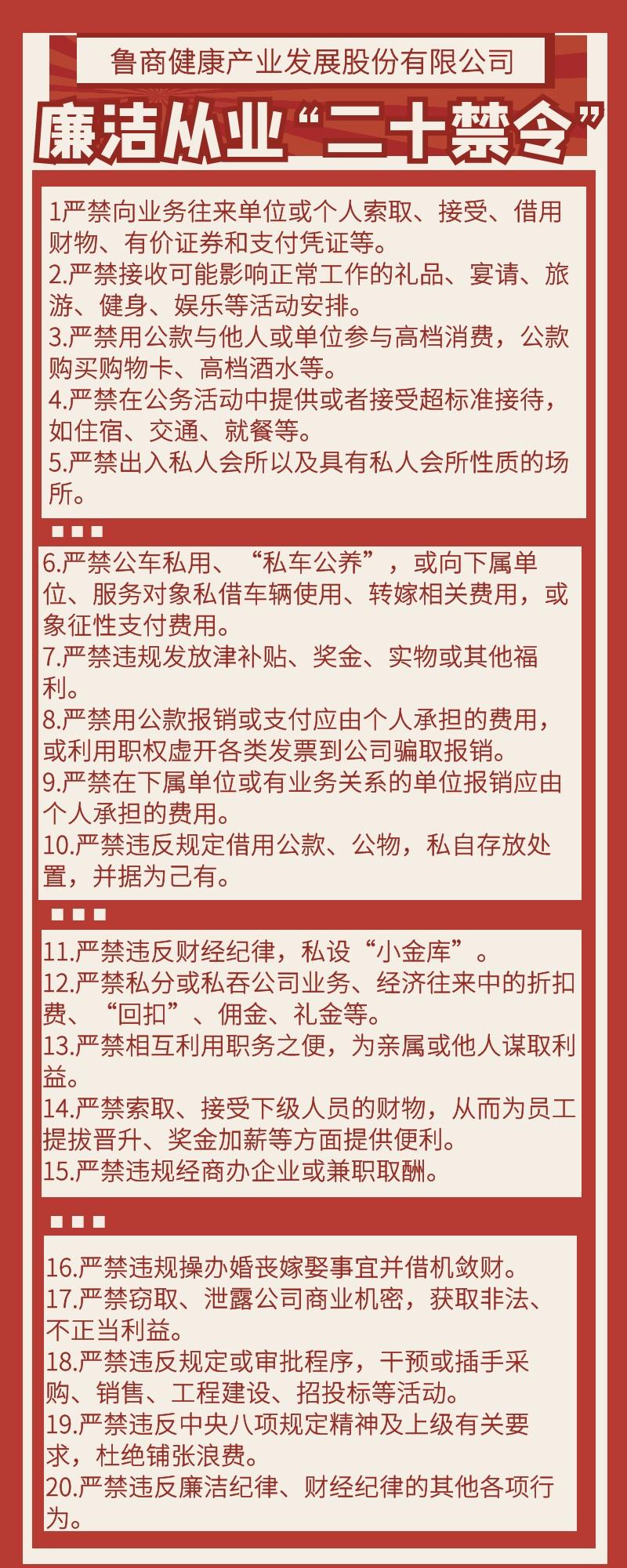 為加強黨風廉政建設,促進公司依法經營、員工廉潔從業,近日,魯商發展制定《廉潔從業“二十禁令”》(以下簡稱“二十禁令”),為公司全體黨員干部職工劃定負面清單,提出硬性要求。
