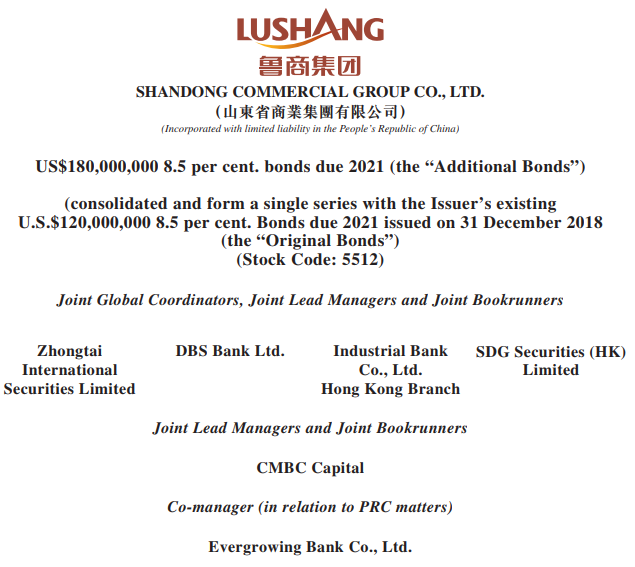 有關在香港聯合交易所有限公司上市的通知—魯商集團— 發行於二零二一年到期金額為180,000,000美元的8.5%債券