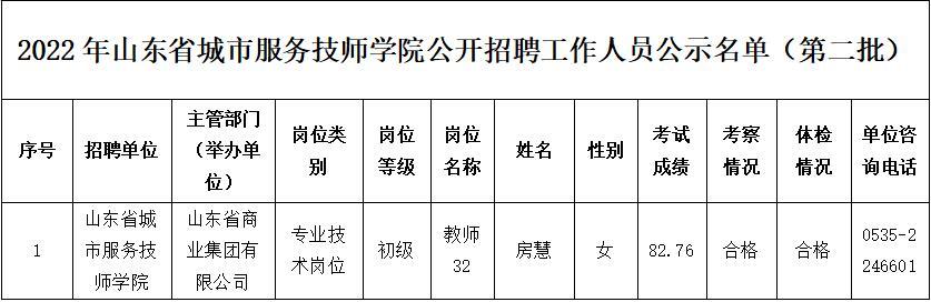 根據(jù)《中共山東省委組織部、山東省人力資源和社會保障廳關(guān)于印發(fā)2022年度省屬事業(yè)單位公開招聘工作實施方案的通知》魯人社發(fā)〔2021〕18號)等相關(guān)規(guī)定,山東省城市服務(wù)技師學(xué)院經(jīng)過公開招聘報名、考試、考察、體檢等工作,現(xiàn)對擬聘用人員(第一批)進行公示,公示期為7個工作日,自2022年8月22日至2022年8月30日(不含節(jié)假日)。公示期間,如對公示人選有異議,請及時向山東省商業(yè)集團有限公司反映。