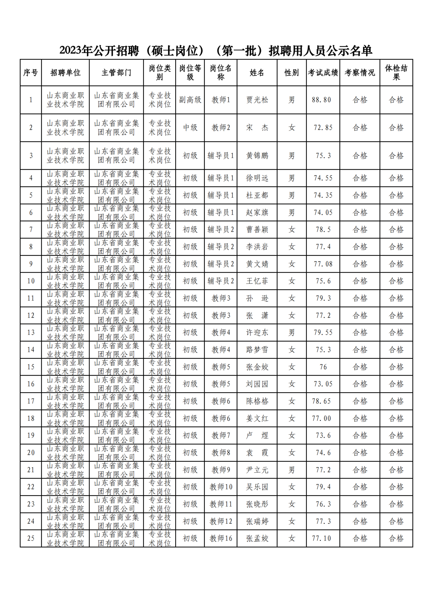 山東商業職業技術學院2023年公開招聘 (碩士崗位)(第一批)擬聘用人員公示名單