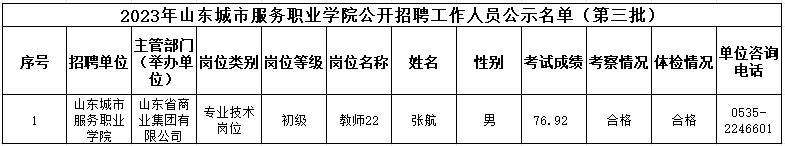根據《中共山東省委組織部、山東省人力資源和社會保障廳關于印發2023年度省屬事業單位公開招聘工作實施方案的通知》(魯人社發〔2022〕23號)等相關規定,山東城市服務職業學院經過公開招聘報名、考試、考察、體檢等工作,現對擬聘用人員(第三批)進行公示,公示期為7個工作日,自2023年12月13日至2023年12月21日(不含節假日)。公示期間,如對公示人選有異議,請及時向山東省商業集團有限公司反映。