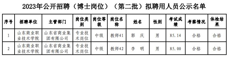 山東商業職業技術學院2023年公開招聘 (博士崗位)(第二批)擬聘用人員公示名單